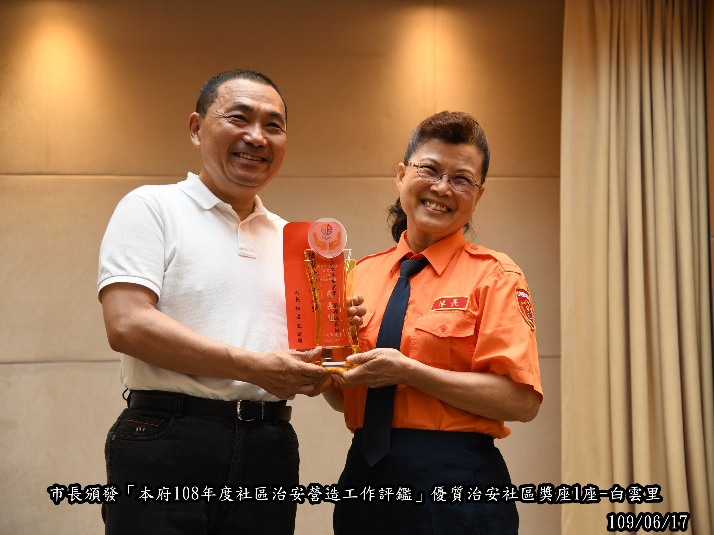 白雲里陳俊地里長自99年成立白雲里守望相助隊47人,一同為白雲里熱心服務至今將近十年,每日風雨無阻為社區服務,努力不懈的巡邏,兢兢業業為治安把關,讓白雲里在治安維護、防汛減災、婦幼安全、環保清潔、弱勢關懷等工作,皆深獲里民肯定,這次榮獲108年優質治安社區成長組獎項,里長非常感恩,也很感動自己的努力受到肯定。 相關照片 社區治安評鑑活動帶動跳 社區治安評鑑活動大合照 108年優質治安社區大合照 隊長楊方美蓮與市長侯友宜合影
