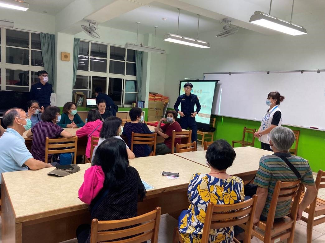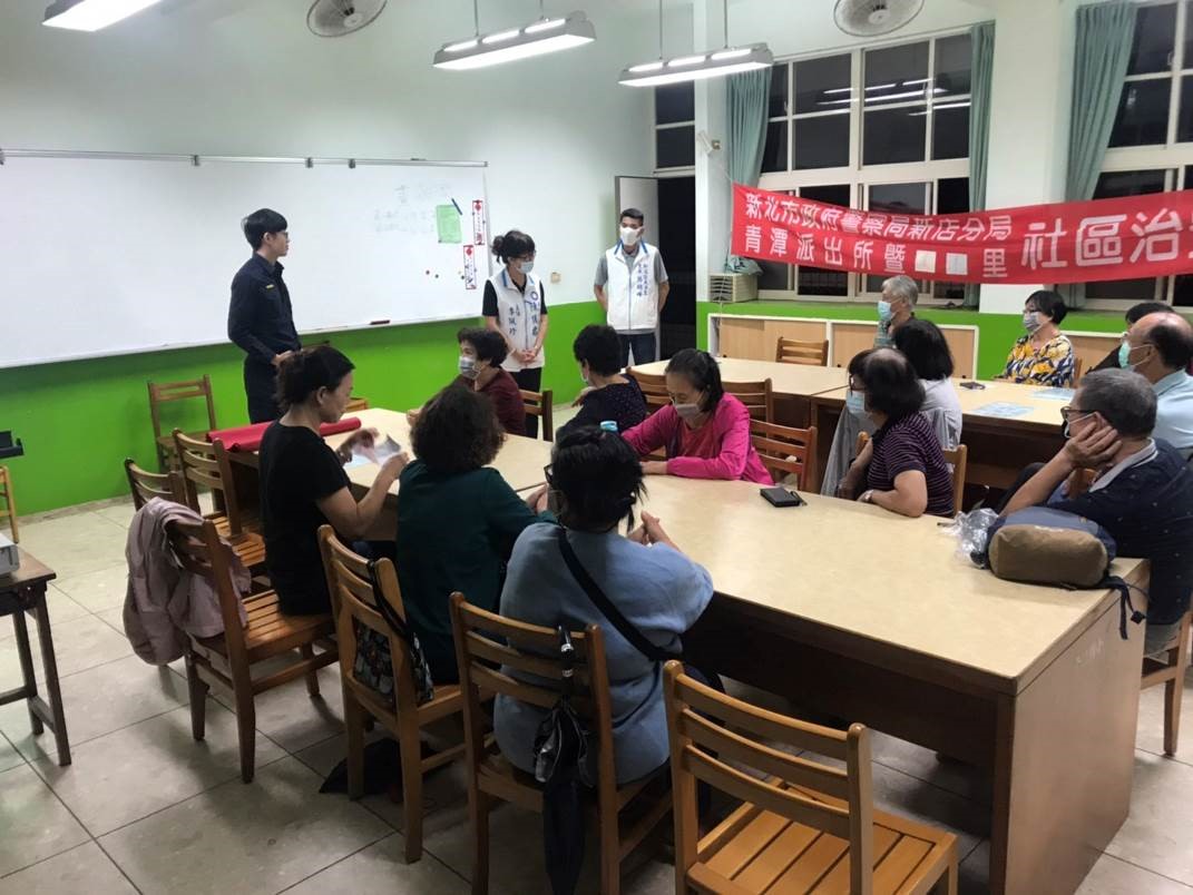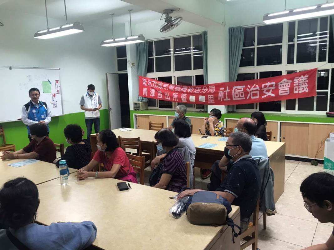 109年10月21日19-21時新店分局青潭派出所暨美潭里於青潭國小舉辦社區治安會議,會中由青潭派出所所長洪澤宇針對轄區內治安、交通狀況進行報告,亦向里民特別宣導反毒、反詐騙、防搶、防竊、反家暴、兩性平等等案例分享,希望能達到預防犯罪之功效。 相關照片 陳儀君議員助理致詞 簡明峰里長致詞 劉哲彰議員助理致詞 青潭派出所所長洪澤宇犯罪預防宣導
