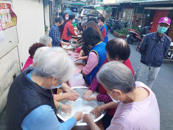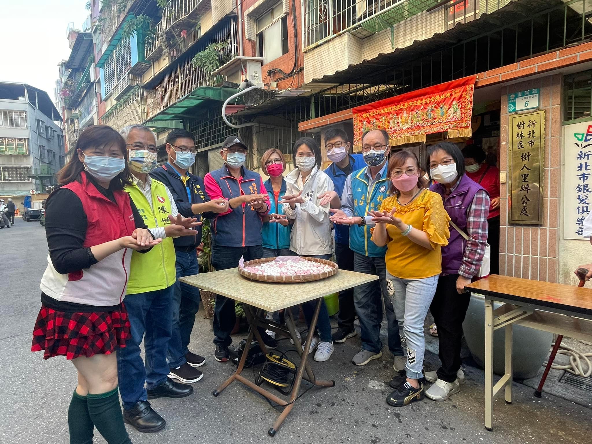 樹林區樹人里每月均會舉辦老人共餐活動,里長邱世昌利用這次老人共餐邀請了議員洪佳君、陳世榮及區長王坤南一起來參與這次樹人里所舉辦的搓湯圓活動,讓里民能夠在逐漸變冷的天氣中享用一碗暖呼呼的熱湯圓。老人共餐的目的是為了希望 長輩們能多多走出戶外與其他里民一同參加活動,增進感情也能減少長輩失智的風險。 相關照片 里民共同製作湯圓 里民開心享用手作湯圓 愛心湯圓 里長邱世昌與議員及里民合影