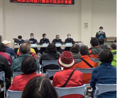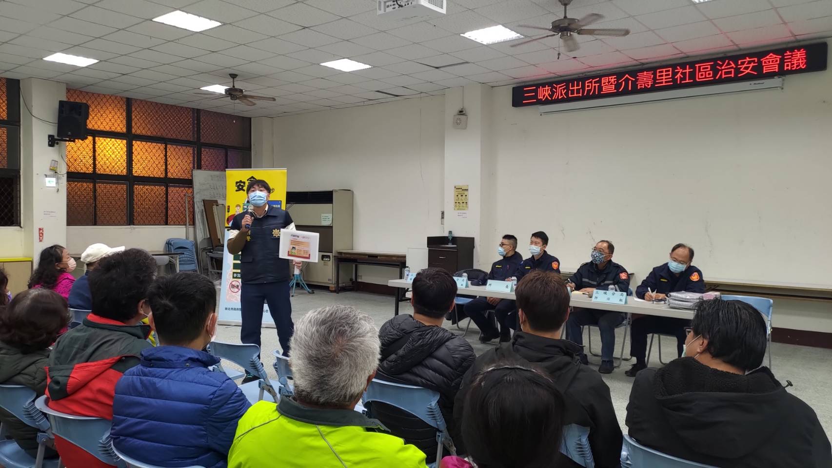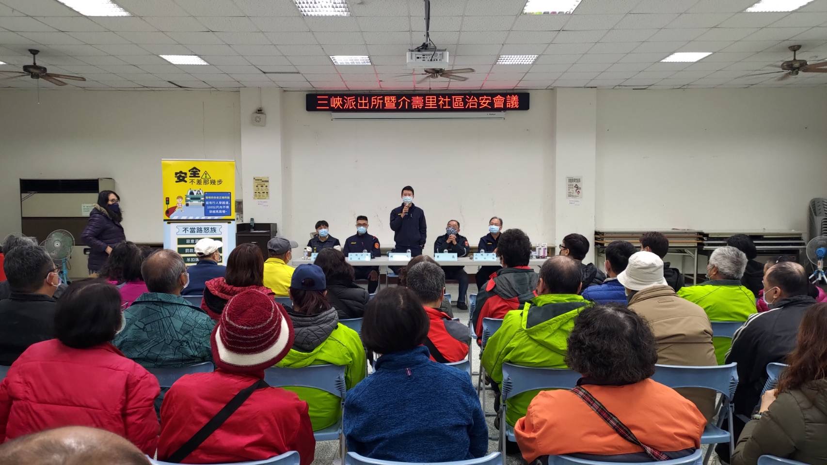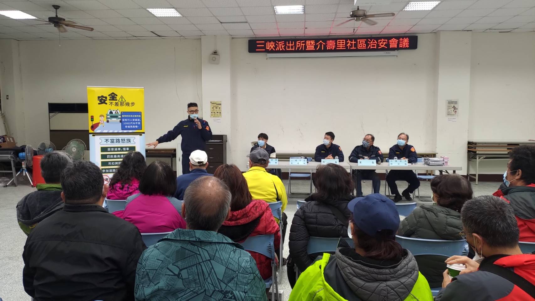三峽分局三峽派出所與三峽區介壽里於112年1月4日在介壽里活動中心辦理社區治安會議,會中除三峽分局防治組宣導跟蹤騷擾防制法相關規定及婦幼安全外,交通組偵查隊及三峽派出所亦針對交通安全、反毒、詐騙、防搶、防竊等預防犯罪宣導。 相關照片 所長鄧博元致詞 交通組巡官黃士峯交通安全宣導 偵查隊小隊長楊皓畯預防犯罪宣導 防治組家防官蔡武育婦幼安全宣導