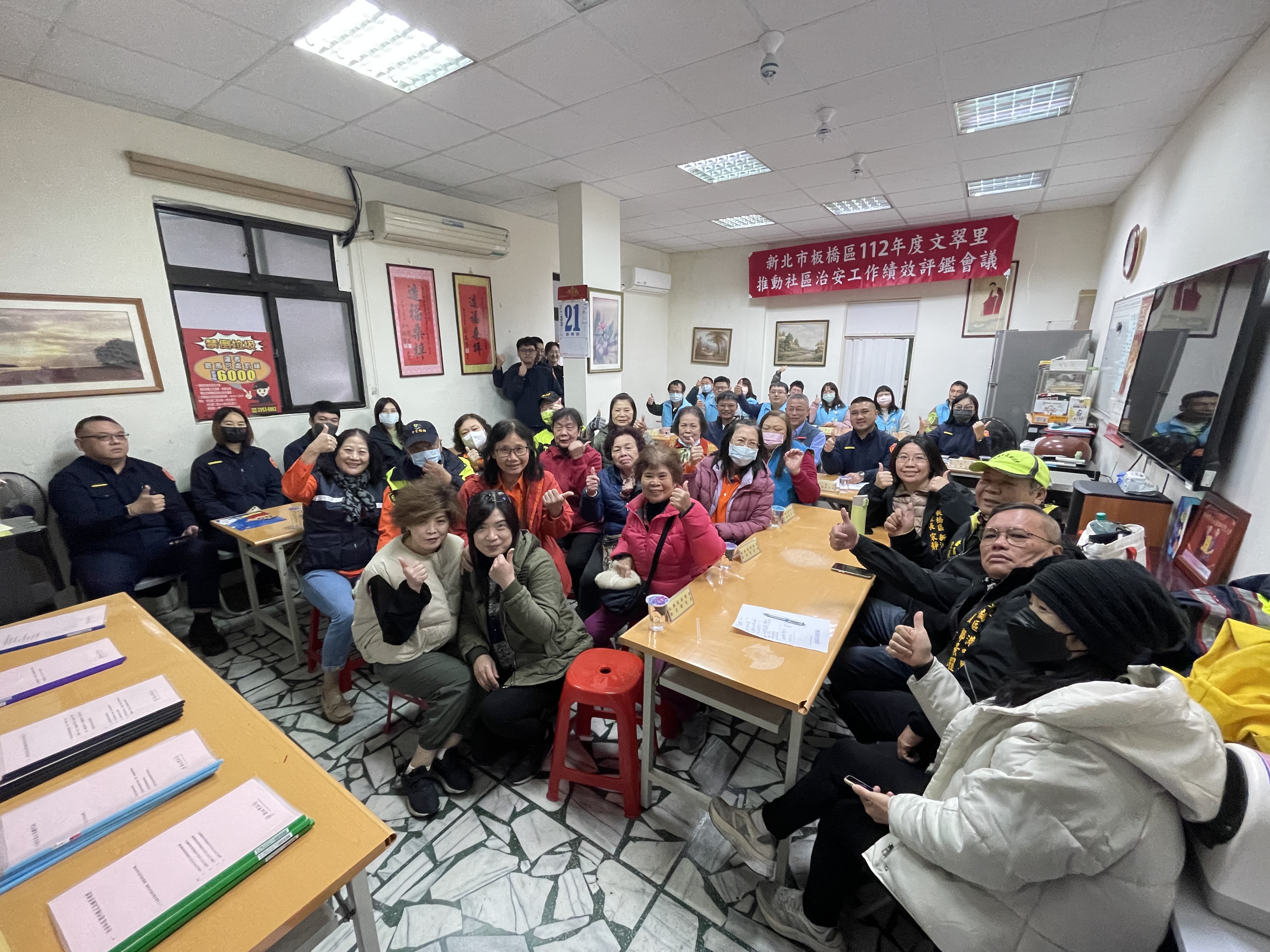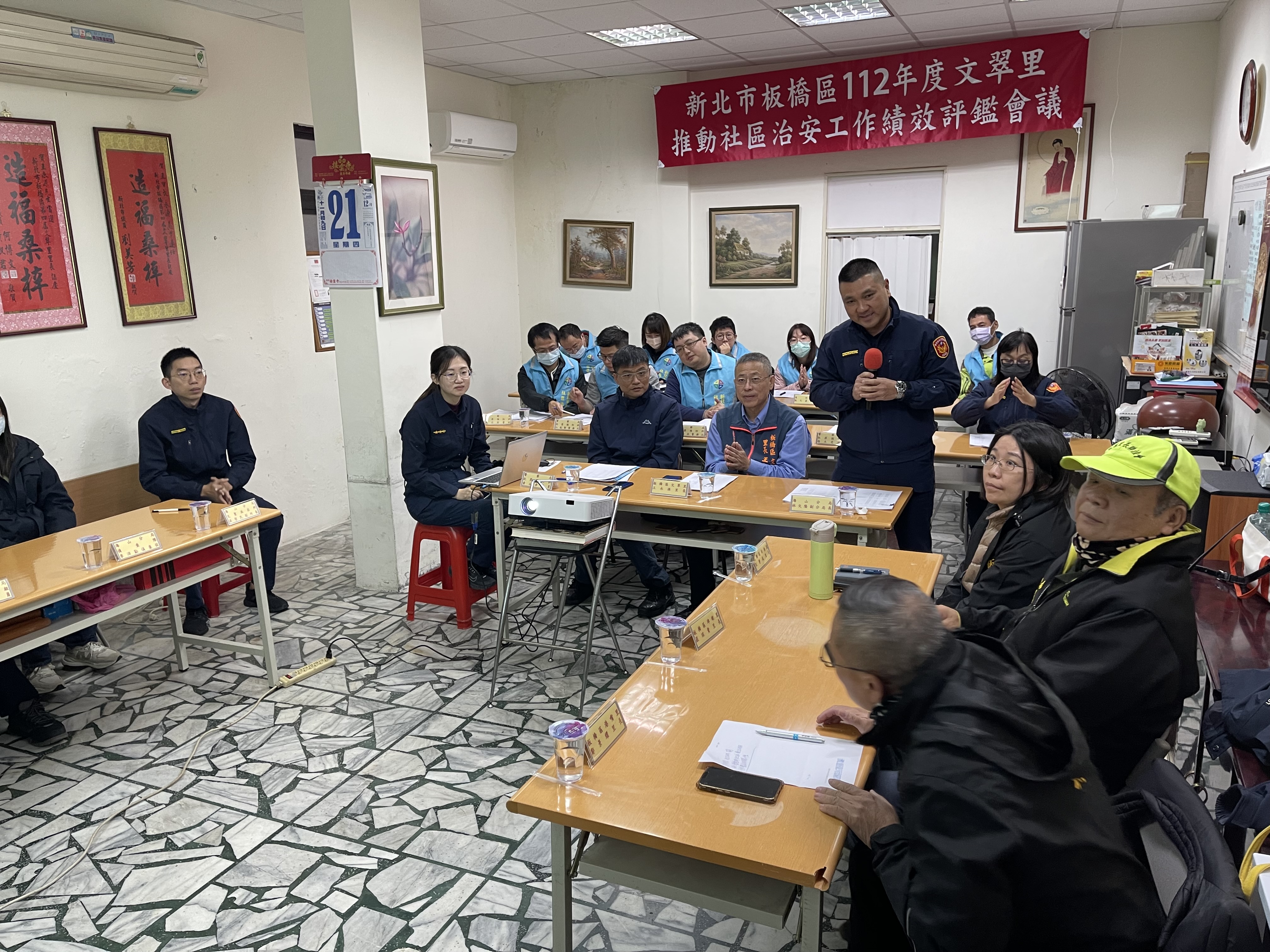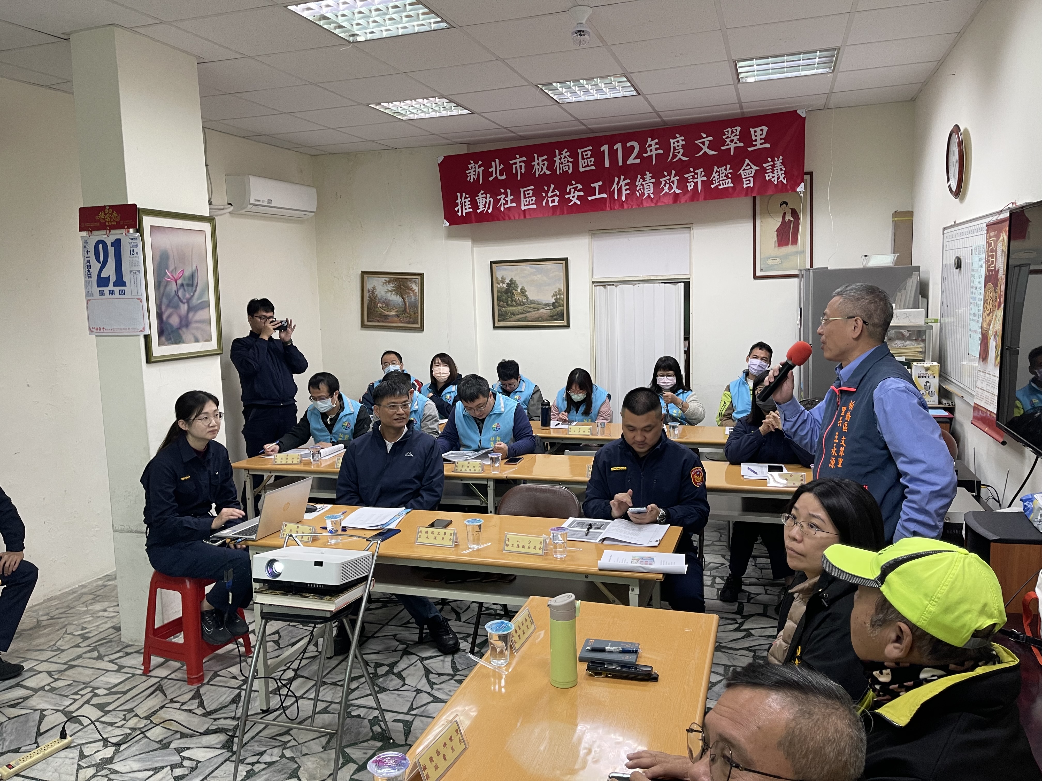 12月21日為112年度文翠里推動社區治安工作績效評鑑會議,由文翠里里長王永源以簡報方式向評鑑委員們報告,並由市府各局處組成評鑑小組針對文翠里一年來的各項工作成果進行書面評核,評鑑圓滿達成,期望能獲得佳績。 相關照片 1.王永源里長致詞並報告社區治安營造成果 2.海山分局副分局長林文隆致詞 3.評鑑委員審核書面資料 4.文翠里評鑑圓滿達成