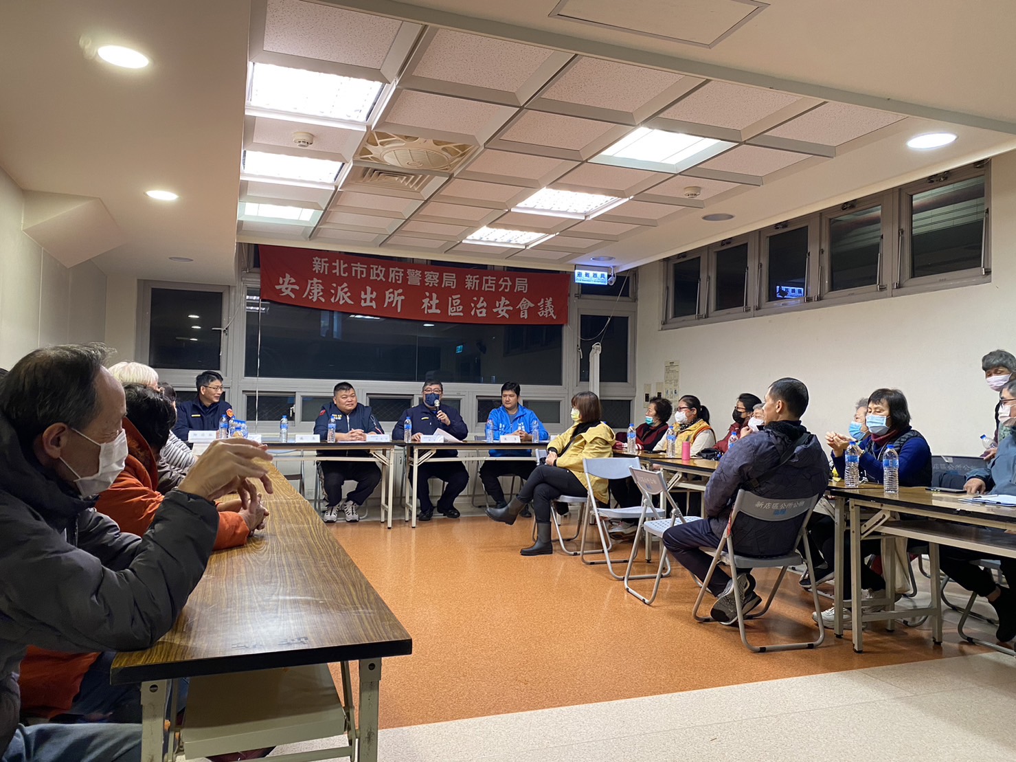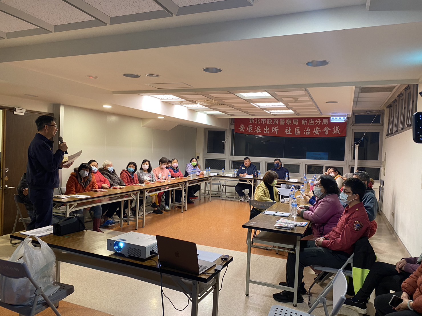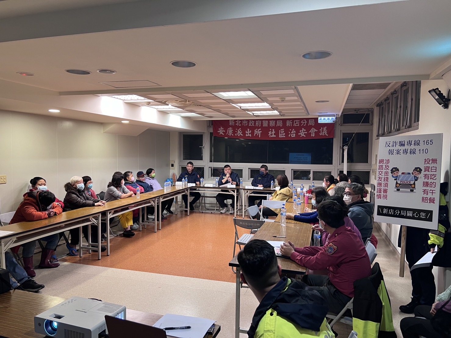新店分局安康派出所於113年1月25日假新店區柴埕市民活動中心6樓召開社區治安會議,於會議中特別向民眾宣導近期常見之詐騙手法,並提醒用路人路口是最易發生交通事故之地點,行經時務必減速慢行。透過本次會議深入走訪社區,增進警民互動,聽取民眾治安建言,回應社區與民眾需求,提升社區民眾婦幼安全、防災及犯罪預防觀念,期許讓市民對新店地區的治安、交通滿意度再升級。 相關照片 里長致詞 安康所長致詞 防治組組長犯罪預防宣導 消防人員宣導
