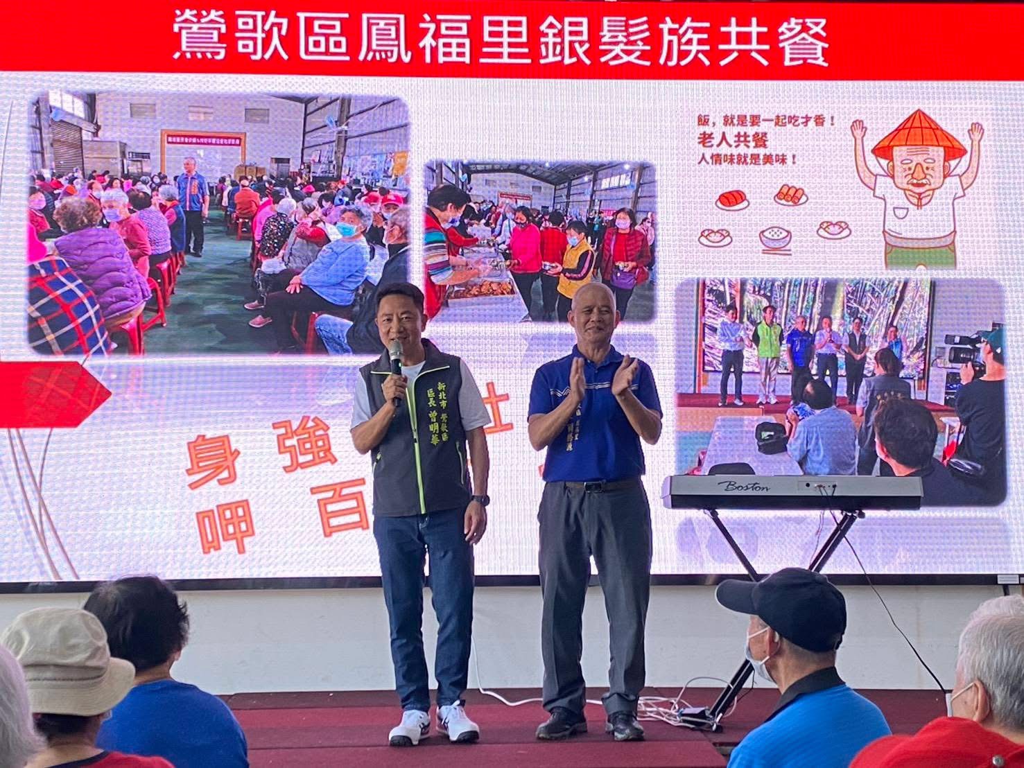 鶯歌區鳳福里於114年5月16日假鶯歌區鳳福市民活動中心舉辦老人共餐活動,活動過程中,許多長者彼此分享生活中的趣事和智慧,場面融洽而熱鬧。這樣的共餐活動不僅讓年長者們感受到社群的關懷,也為他們提供了一個建立友誼的平臺。透過共餐,鳳福里希望建構一個更具凝聚力的社群環境,讓長者們在繁忙的生活中找到彼此的陪伴與支援。 相關照片 共餐一隅 餐點 共餐一隅 鶯歌區區長曾明華致詞