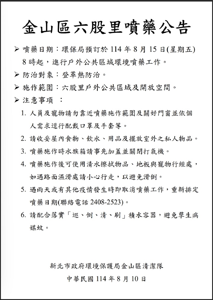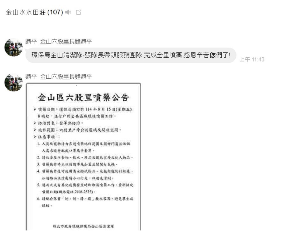 金山區六股里於8月15日由里長鍾鼎平結合金山區清潔隊於六股里內執行驅蟲噴藥,天氣炎熱預防性噴藥避免蚊蟲孳生,本次噴藥利用社區LINE群組公告,提醒民眾注意,並且順利完成,為社區安全加上保障。 相關照片 里長在勤組宣導噴藥 清潔隊協助噴藥 噴藥公告 噴藥合影