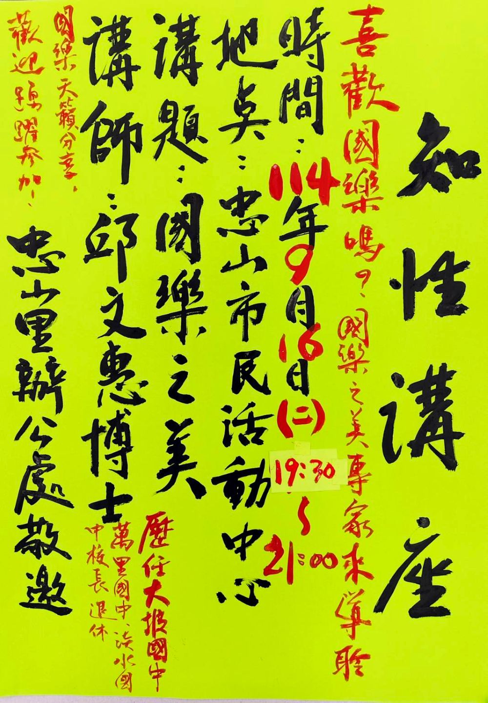 汐止區忠山里吳里長於本月16日於里內舉辦知性講座-國樂之美,敬邀國樂老師邱文惠博士介紹國樂,也透過講解促進里民交流,過程透過音樂共同交流及一起同樂,並提供平台讓里民聯繫情誼,並打造溫馨溫情且歡樂的忠山里。 相關照片 忠山里邀請國樂老師舉辦知性講座-國樂之美 忠山里舉辦知性講座與里民同樂 忠山里舉辦知性講座-國樂之美敬邀國樂老師與里民同樂 忠山里舉辦知性講座