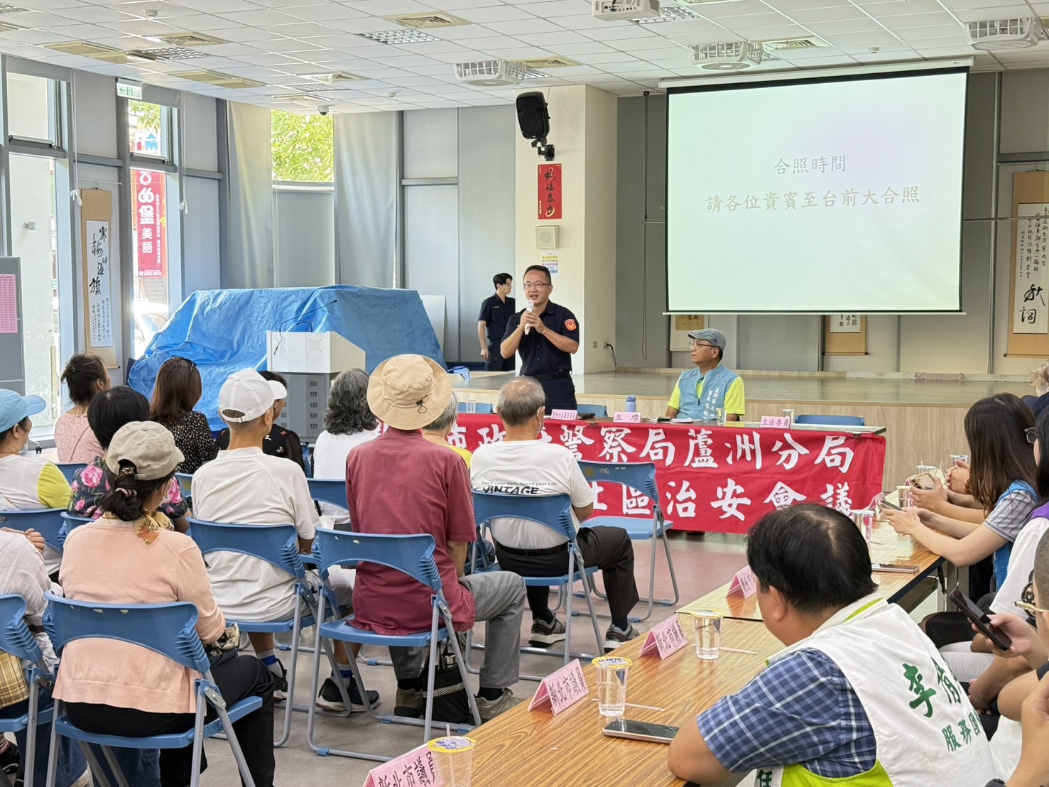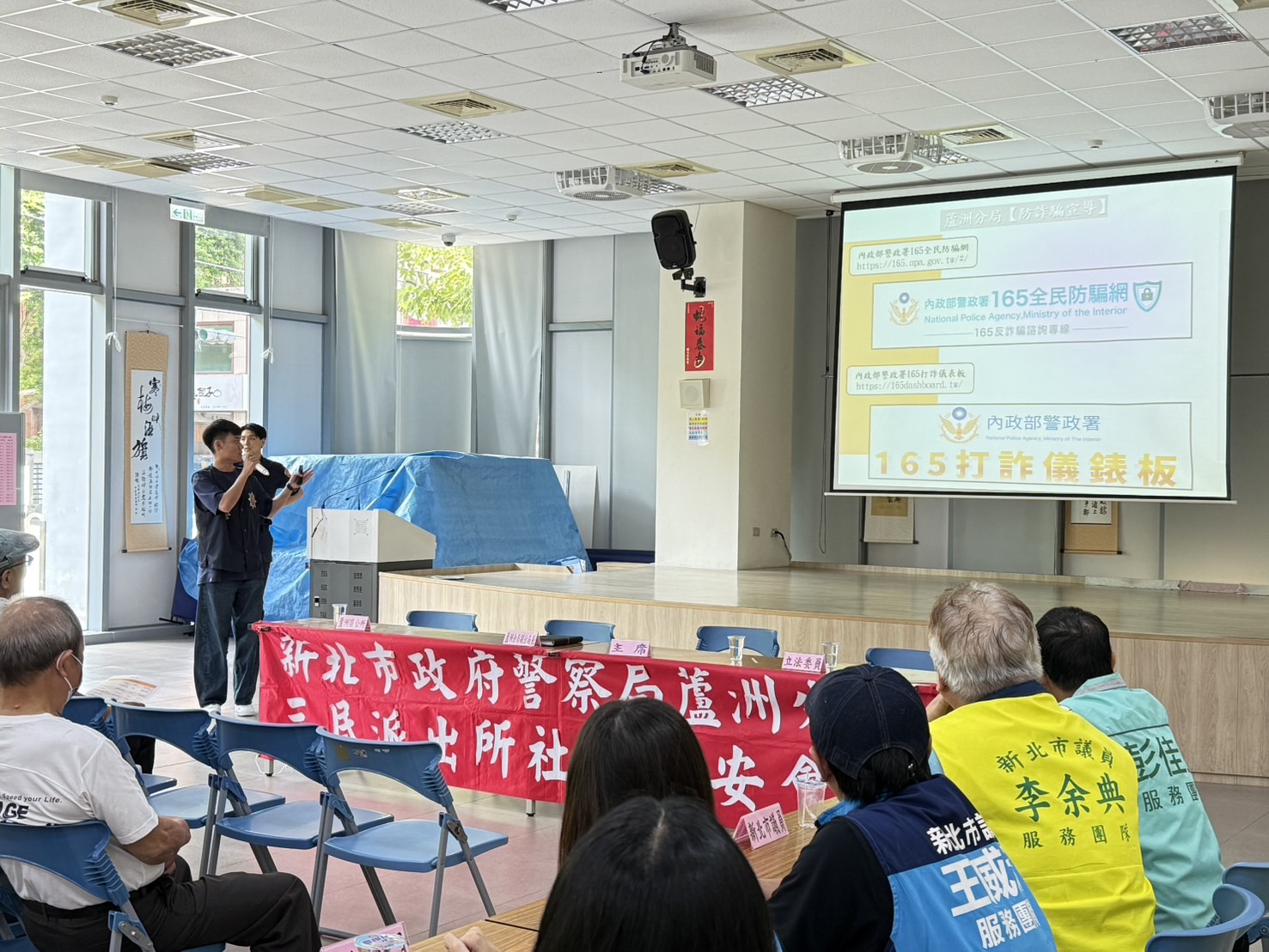 為了增進與鄰里社區間的聯繫交流及建築社區安全防護網,蘆洲分局與水湳里辦公室於9月24日10時舉辦社區治安會議,三民派出所及交通組、防治組、偵查隊向里民朋友們宣導反詐騙及交通安全、婦幼安全的重要性,提供居民重要的觀念及提升對於生活周遭潛在風險的警覺性,也與里民交流轄內治安狀況,透過警民合作建立一個安全、安心、安居的幸福社區。 相關照片 蘆洲分局副分局長指導 大合照 婦幼安全宣導 犯罪預防宣導