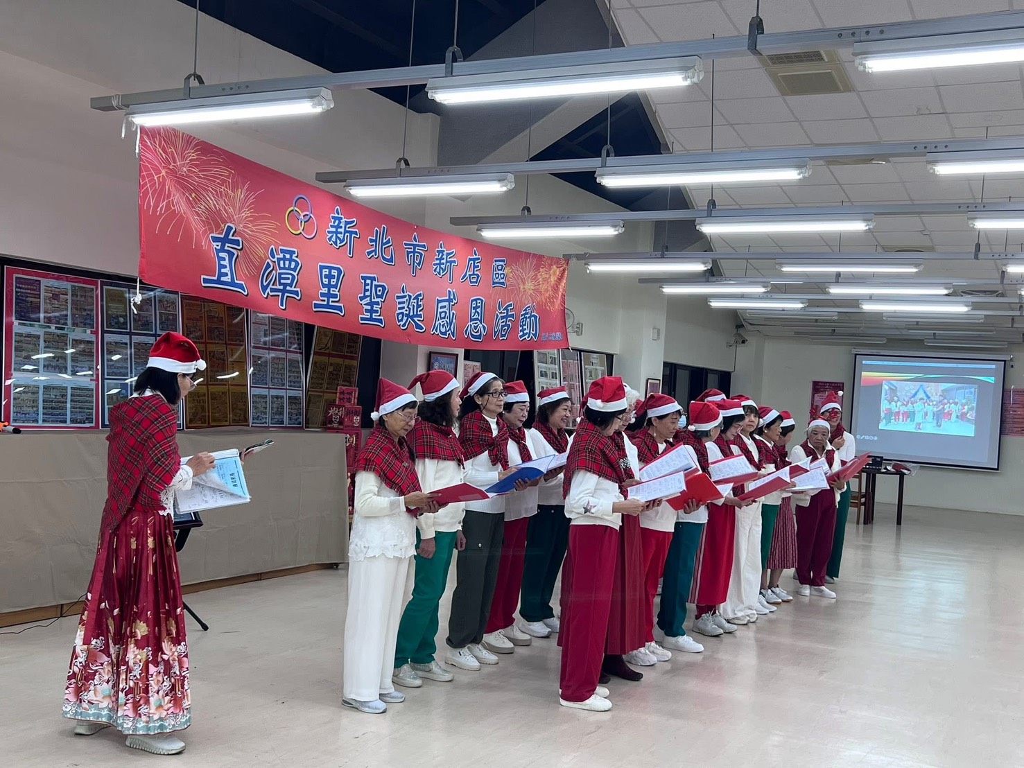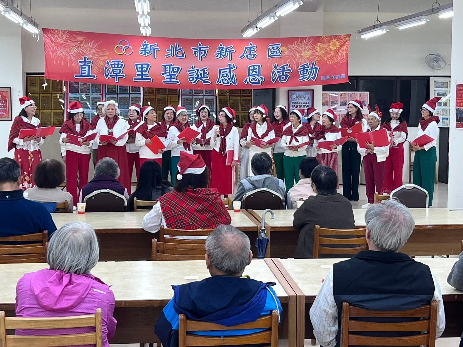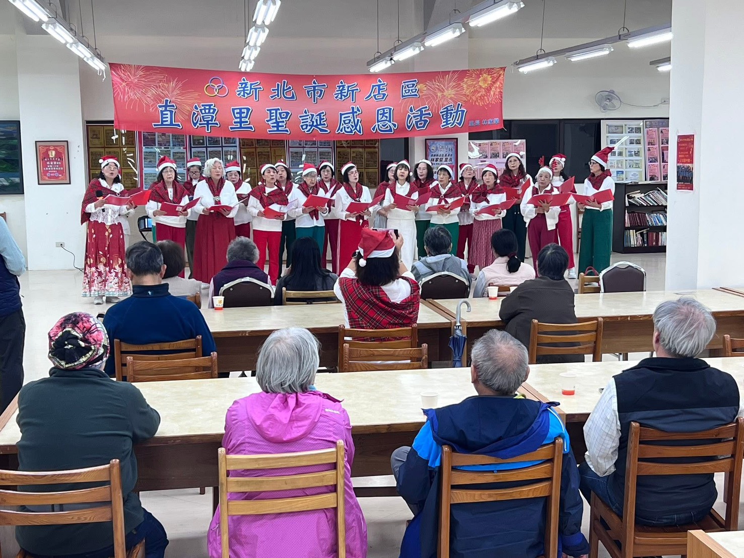 新店區直潭社區住戶由瑪格老師指導之下共組合唱團,合唱團團長不遺餘力召集社區住戶,每週利用時間反覆練習,唱出直潭溫馨有愛的歌聲,於114年12月23日晚間7時,在新店區直潭活動中心,舉辦銀髮族社團「愛無限!聖誕報佳音活動」,準備了糖果餅乾及美妙的歌聲,歡慶聖誕節活動,讓里民感受聖誕節的氣氛。 相關照片 1-合唱團報佳音 2-社區報福音 3-里民同歡 4-會後合影