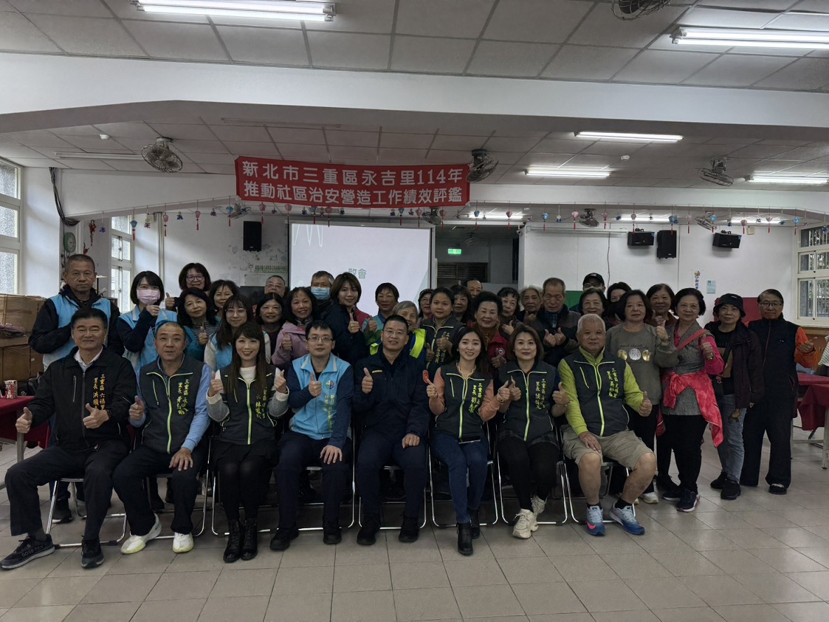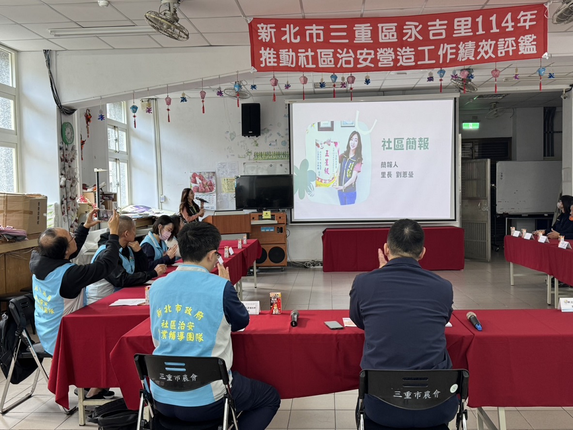 三重區永吉里於114年12月15日在新北市三重區車路頭街133號(永盛市民活動中心),辦理114年度推動治安社區工作績效評鑑,由警察局犯罪預防科警務正游孟丞率市府評鑑小組團隊進行評鑑,里長劉蕙瑩進行社區簡報,將永吉里透過警政、社政、消防、婦幼安全、弱勢關懷等,各方向整合展現出來,在劉里長認真的帶領下,永吉里打造成更優質的治安社區。