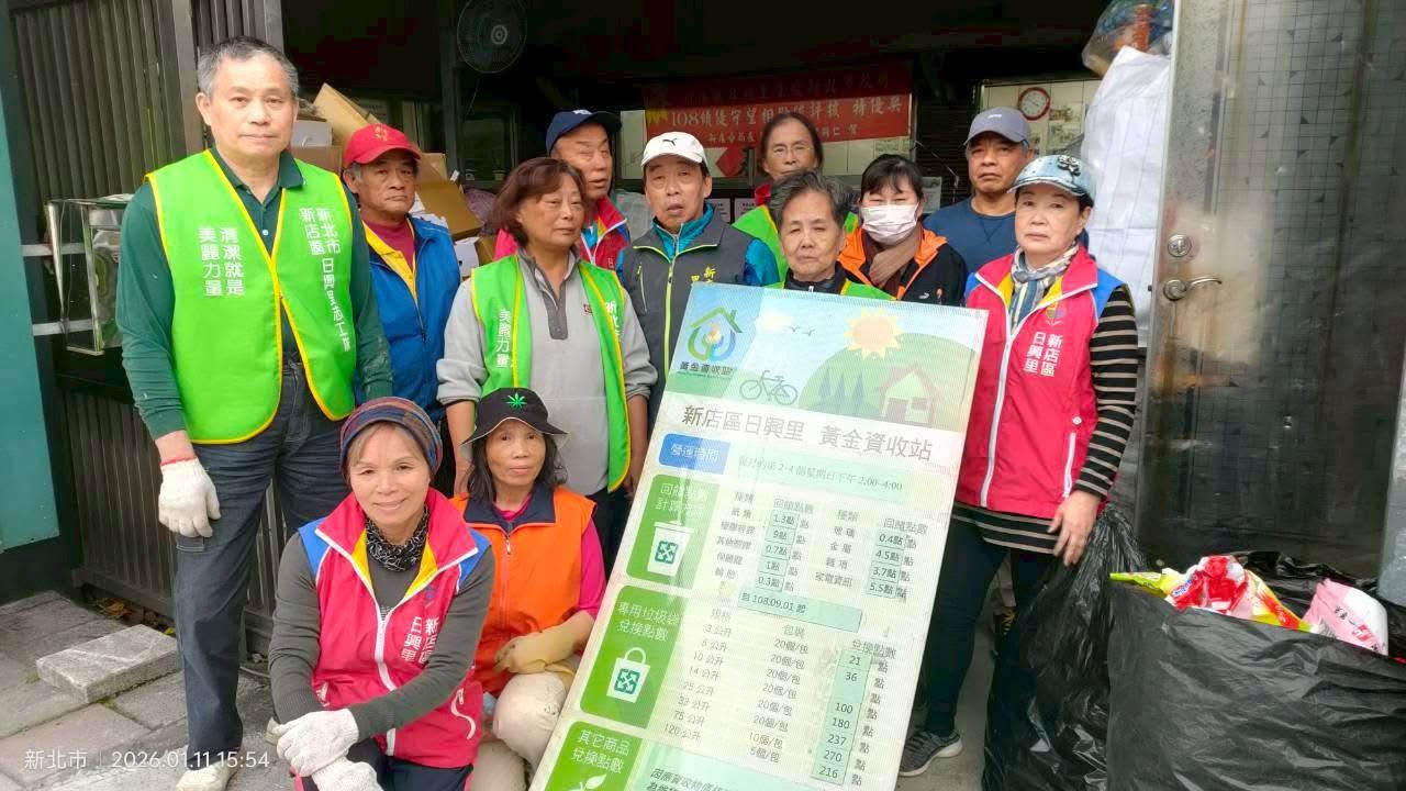 115年1月11日新店區日興里辦理資源黃金回收日,家家戶戶的居民,平日將可回收的物品,分門別類地蒐集起來,利用每個月里內的回收日,將可回收的紙類、鐵鋁罐、塑膠類、金屬類及可回收的電器(電子)產品,大包小包帶到回收站,在環保志工的協助之下一一分類,讓資源變黃金,換取環保專用垃圾袋,並加強宣導有關防治病媒蚊的根本之道是「巡、倒、清、刷」,清除積水容器以消滅孳生源;防蚊四寶-個人防護,白天外出時,穿著淺色長袖衣褲,減少皮膚裸露。