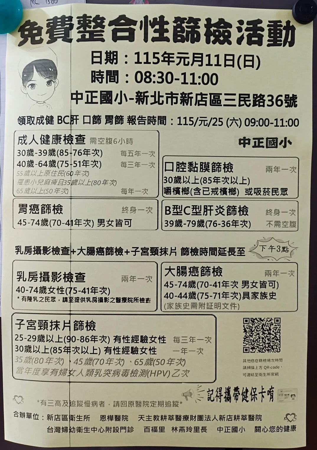 115年1月11日8石30分至11時許,在新店區中正國小,由新店區百福里、新店區衛生所、耕莘醫院及中正國小,共同辦理免費整合性篩檢活動,有成人健康檢查、胃癌篩檢、口將黏膜篩檢、B型C型肝炎篩檢、乳房攝影檢查、大腸癌篩檢、子宮頸抹片篩檢,只需帶健保卡就可以早期檢查,早期篩檢預防,轄區里民皆踴躍出席,達到預防篩檢之目的。 相關照片 1-免費健檢宣導 2-參加人員 3-宣導合照 4-百福里長