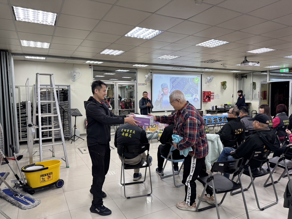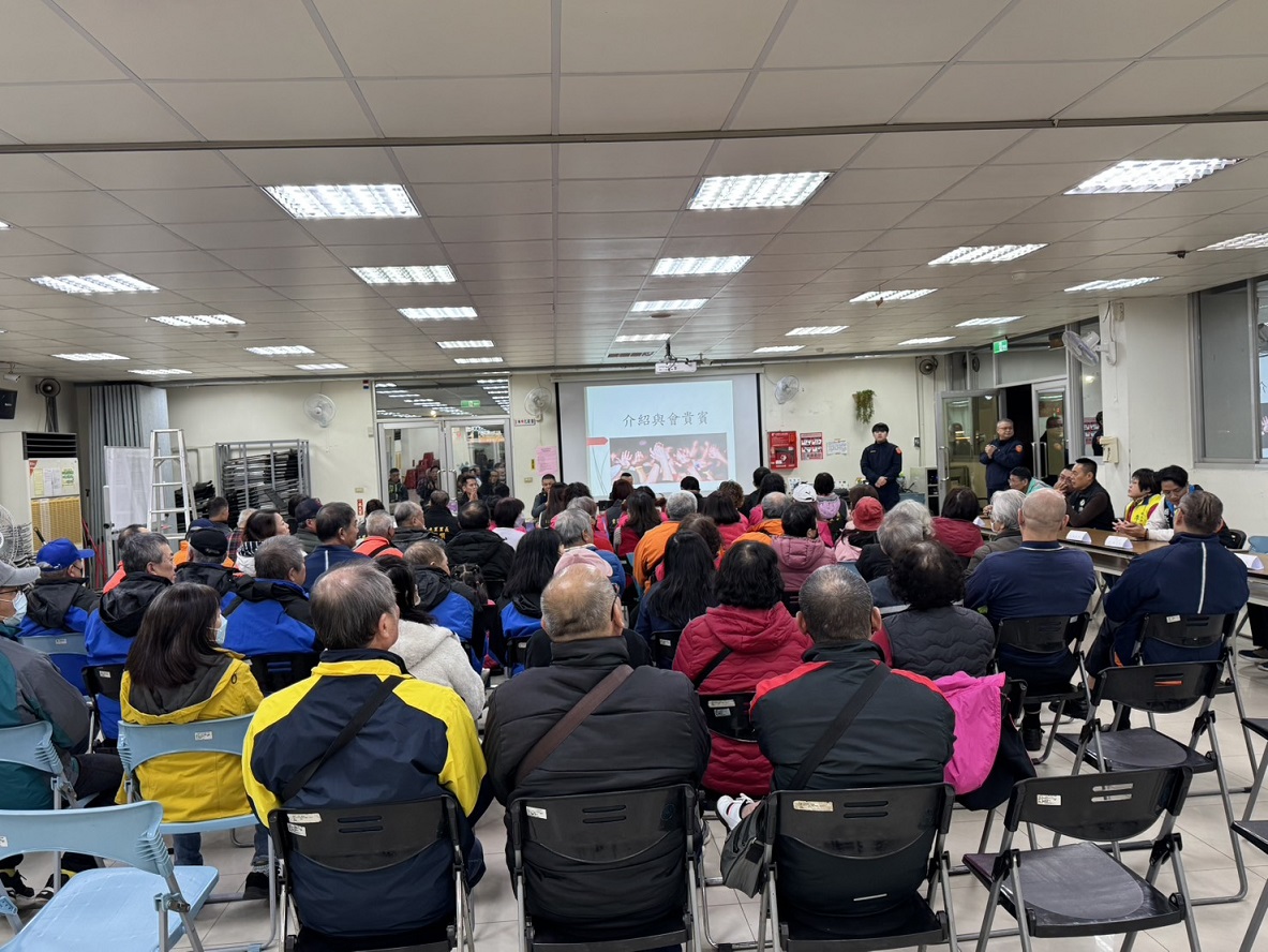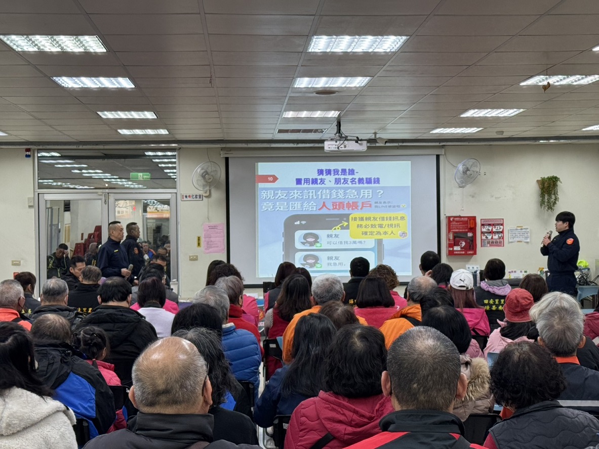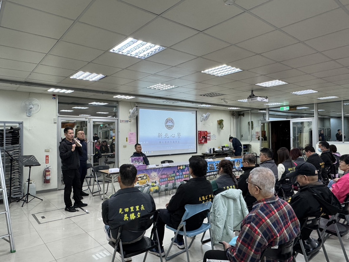 三重分局光明派出所與田安里於115年1月7日19時30分,在三重區過圳街19號(過圳市民活動中心)共同辦理社區治安會議,由分局交通組巡官黃柏蒼交通安全宣導及偵查隊偵查佐馮筠雯反詐騙宣導,光明派出所所長劉佩瑀報告里內的治安狀況,聽取民眾治安、交通建言及提供有獎徵答,建立良好警民互動關係。 相關照片 所長劉佩瑀預防犯罪.反詐欺.反詐騙等宣導 會議進行中 交通組巡官黃柏蒼交通安全宣導 有獎徵答