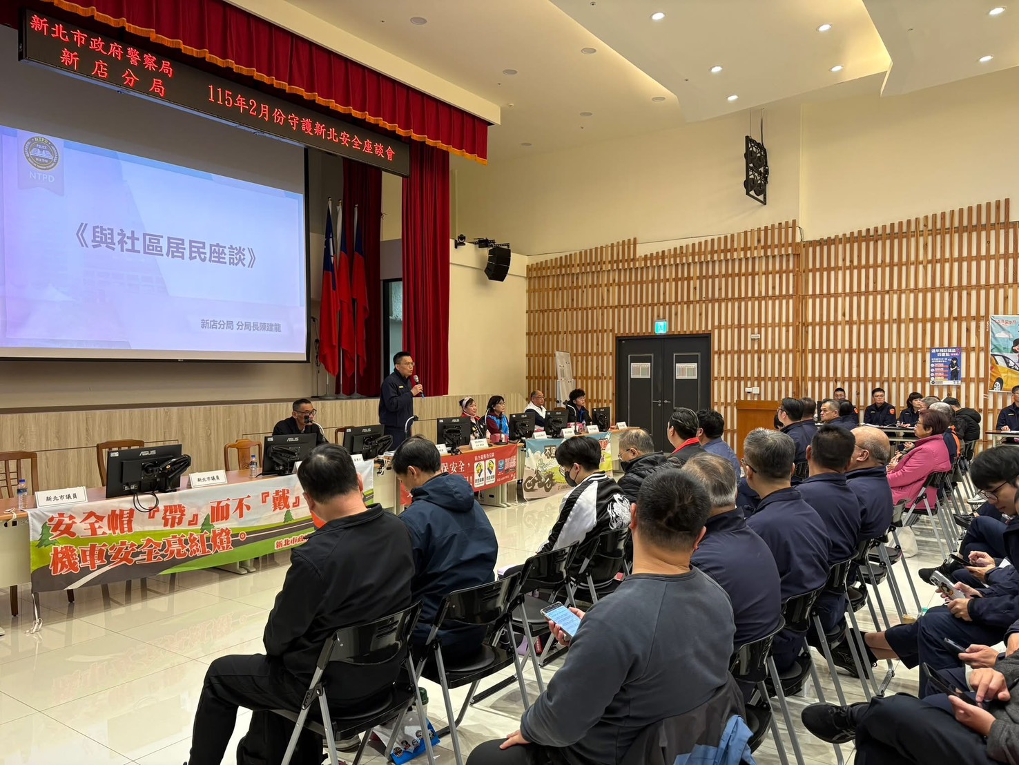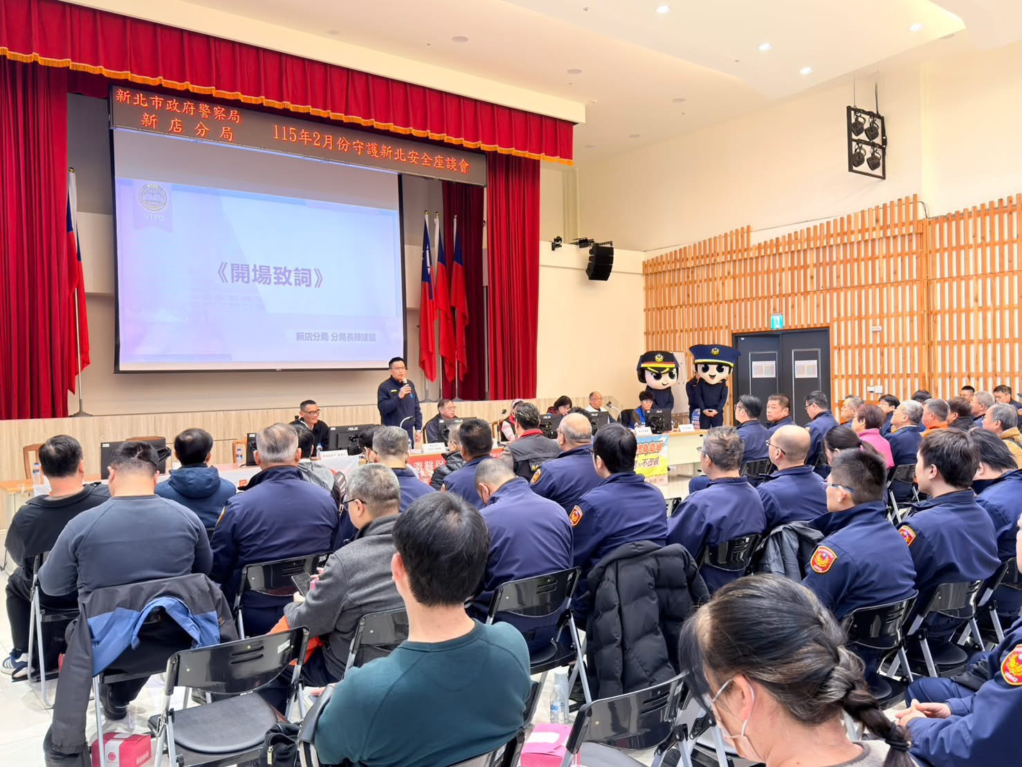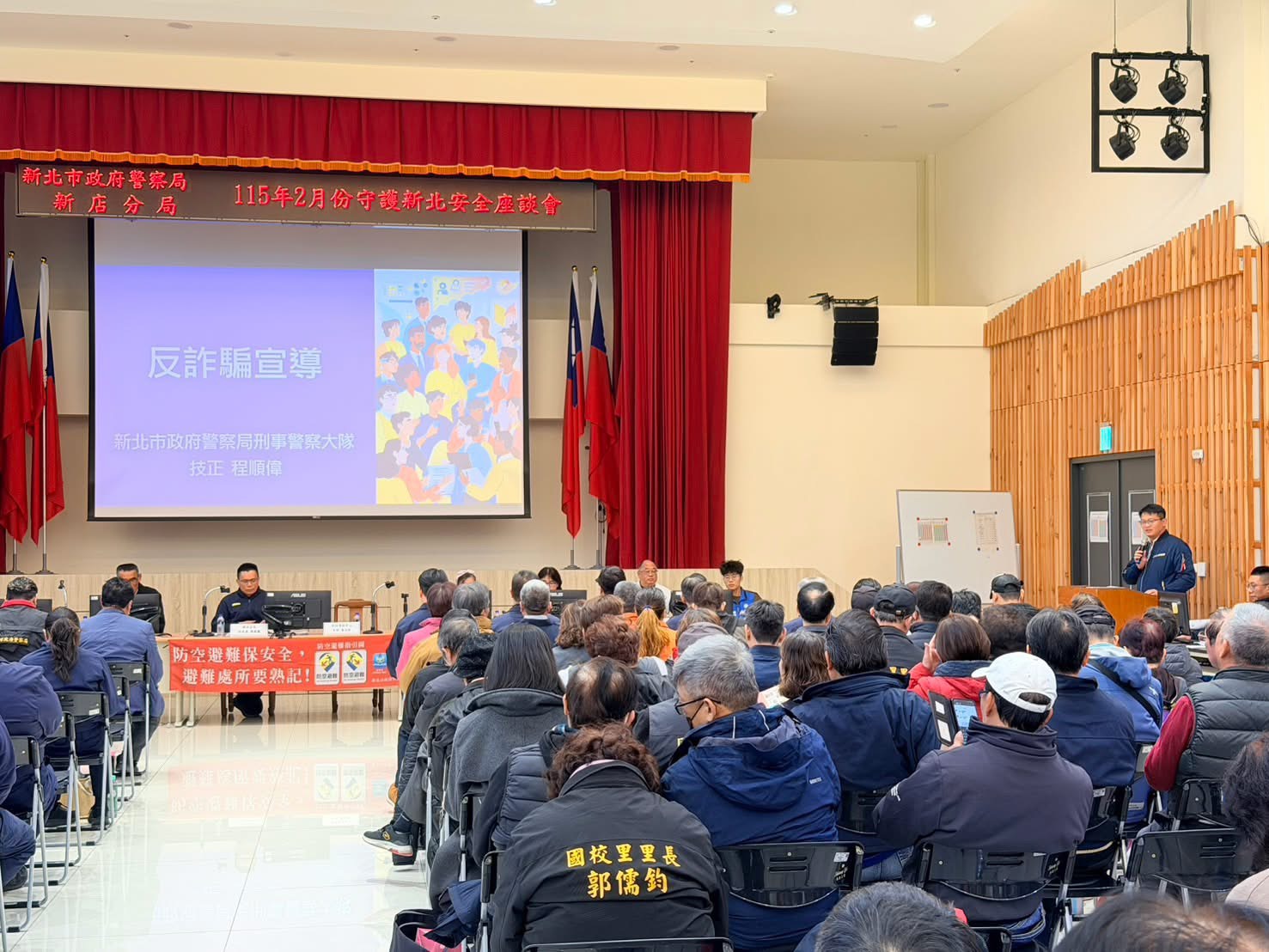 115年2月9日14時新店分局辦理新店區「守護新北安全座談會」,社會防衛韌性、法詐、反毒、交通安全、加強重要節日安全維護工作一次到位,為提升民眾面對災害之應變能力,邀集立法為回、轄區議員、里長、民力幹部、金融機構、中小學及飲酒處所等與會,深入說明災害發生時的應處能力,已強化自我保護及應變能力。深化反詐教育,面對新興多元詐騙手段,本分局講授識詐反詐課程,強化第一線里長及金融機構人員阻詐能力。適逢農曆春節將近,分局同步說明加強重要節日工作整備情形,結合民力達成「治安平穩、交通順暢、民眾安心」的工作目標。