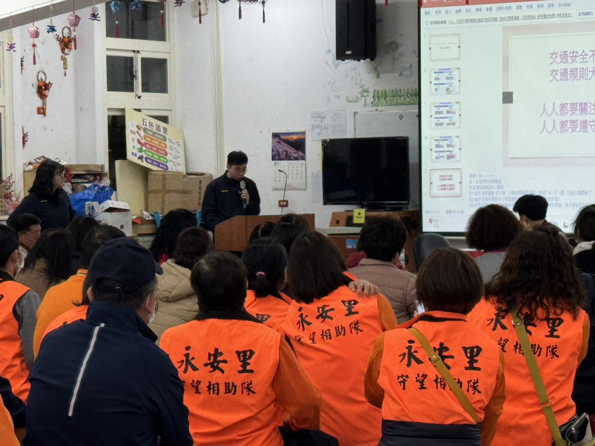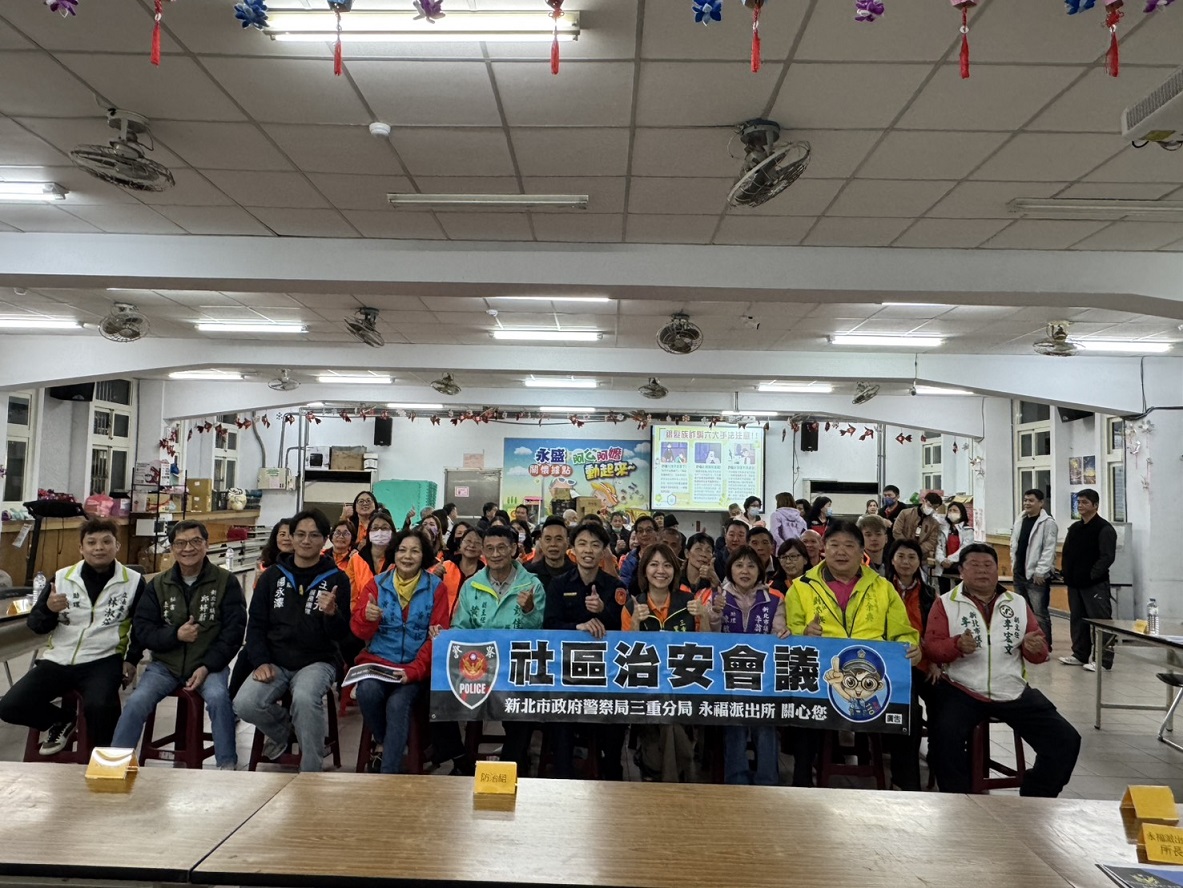 三重分局永福派出所與永安里於115年3月3日19時30分,在三重區車路頭街133號(永盛市民活動中心)共同辦理社區治安會議,由分局交通組警員鄒明翰交通安全宣導及偵查隊偵查佐馮筠雯反詐騙宣導,永福派出所所長陳政延報告里內的治安狀況,聽取民眾治安、交通建言及提供有獎徵答,建立良好警民互動關係。 相關照片 所長陳政延預防犯罪.反詐欺.反詐騙等宣導 交通組鄒明翰交通安全宣導 偵查隊偵查佐馮筠雯反詐騙宣導 社區治安會議後合影