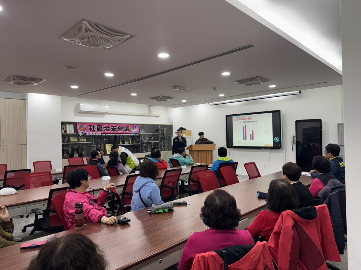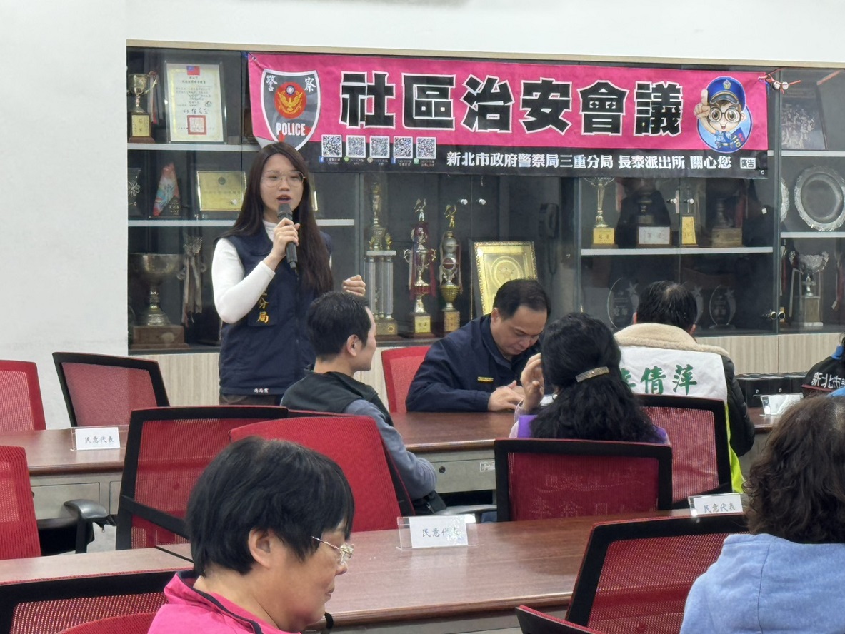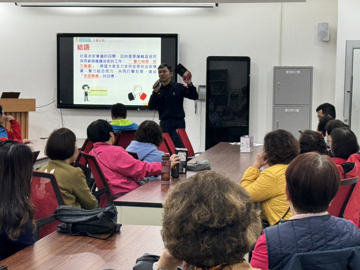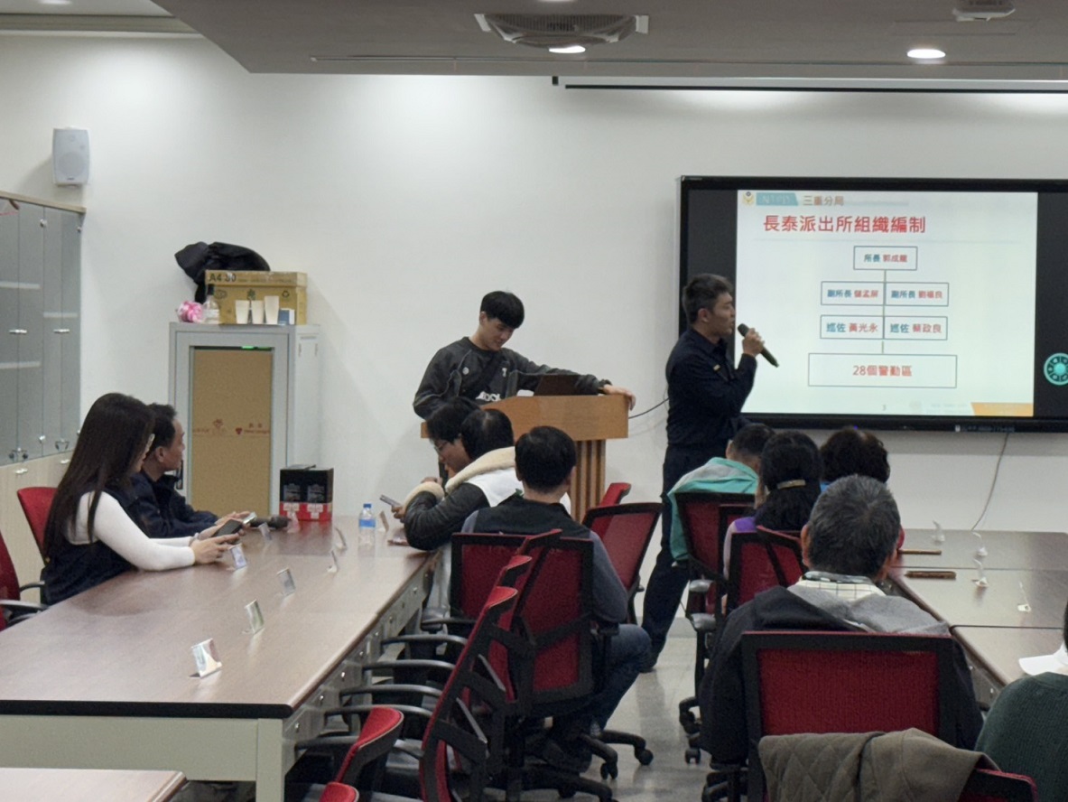 三重分局長泰派出所與龍門里於115年3月4日19時30分,在三重區介壽路32號2樓(光榮國民小學視聽教室)共同辦理社區治安會議,由分局業務單位進行各類反詐騙及交通安全等等的宣導,長泰派出所所長郭成龍向里民報告里內的治安狀況及交通,藉由社區治安會議的辦理,聽取民眾治安建言,並適切予以回應及有獎徵答並提供精美的防詐宣導品,建立良好警民互動關係。 相關照片 所長郭成龍預防犯罪.反詐欺.反詐騙等宣導 偵查隊偵查佐馮筠雯反詐騙宣導 會議進行中 有獎徵答