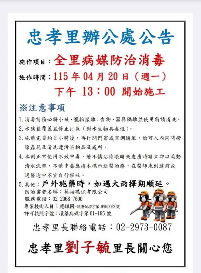 115年4月20日三重區忠孝里里長劉子毓,親自帶領環保清潔人員將里內街道、巷弄及各樓梯間環境清潔消毒,做好里內社區環境整潔,在劉里長認真的帶領下,讓忠孝里里民生活居住在一個環境優良安全的社區內。 相關照片 忠孝里消毒日期公告 里長劉子毓帶領消毒人員進行里內消毒 里內消毒中 巷弄消毒