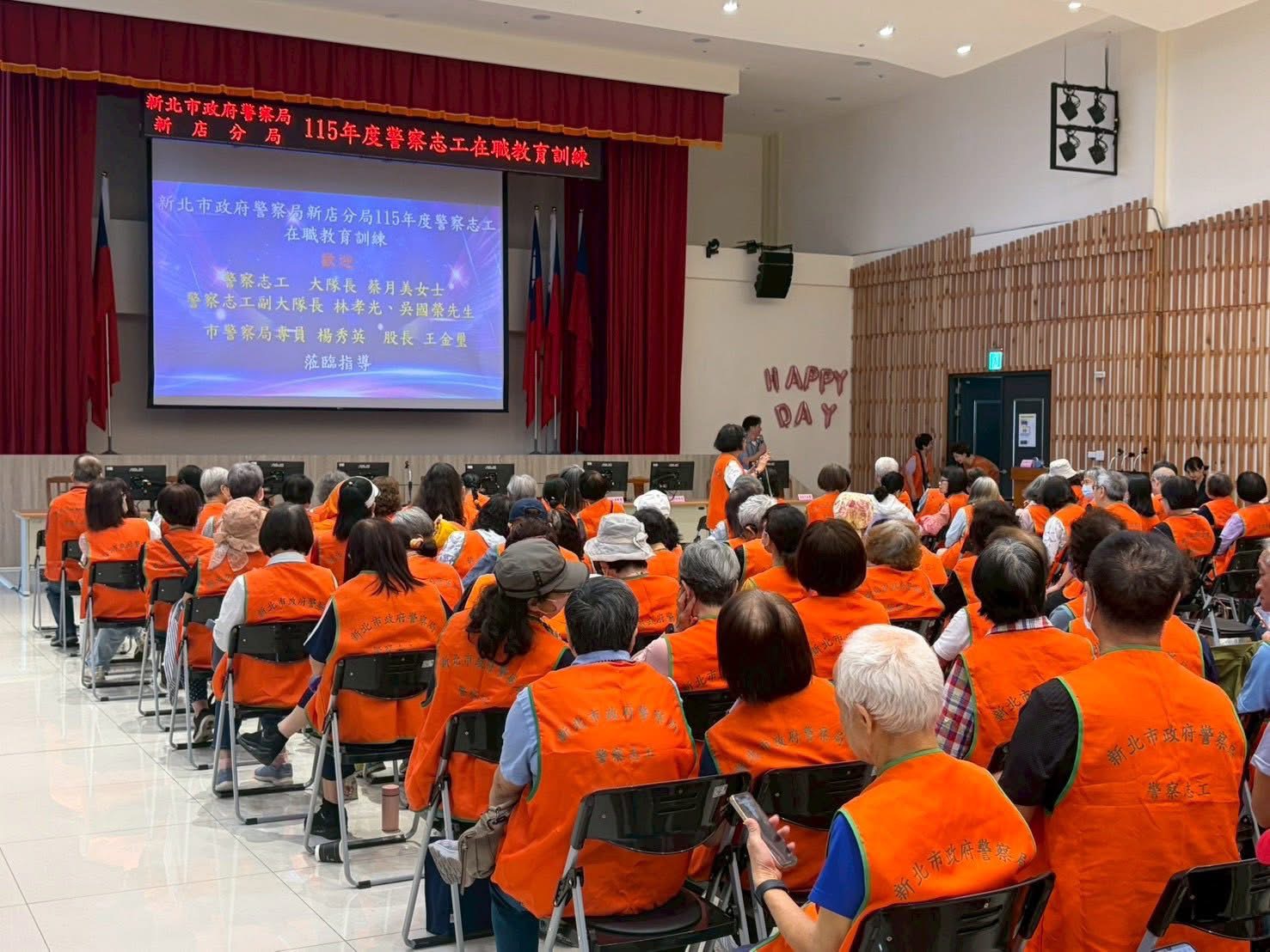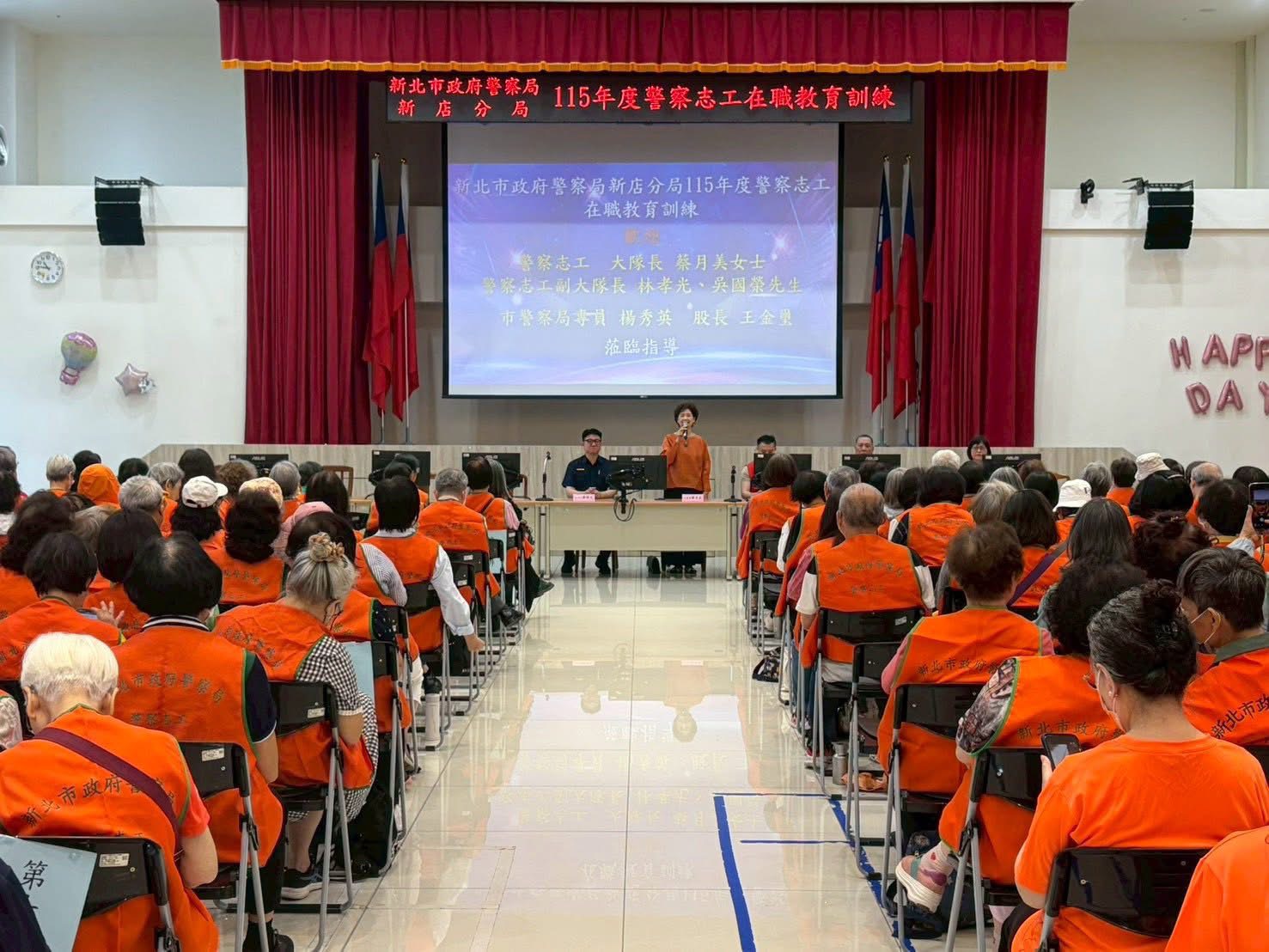 115年4月21日在新店分局禮堂特別召集警察志工辦理在職教育訓練,邀請律師講述人生二大法律問題,席間大家踴躍發問,達到訓練之目地,營養師講述「吃對食物,抗老又有好體力」等實用且貼近生活之課程,內容豐富多元,深入淺出,深獲與會人員熱烈迴響。並加強宣導防阻詐騙相關知識,透過專業講解與實務分享,協助志工夥伴精進,提升風險辨識能力,並進一步建立「警民合作、共維治安」,以提升警察夥伴五力之影響力。
