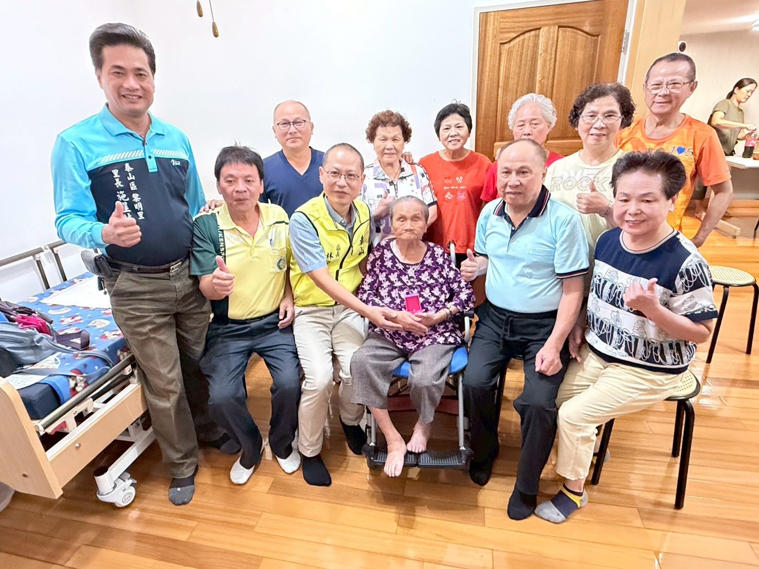 九九重陽敬老日,泰山區長林俊宏親自造訪本區百歲人瑞,致贈金鎖片與敬老狀,表達誠摯的祝賀與敬意。區長林俊宏祝福長輩們身體健康、笑口常開、福壽綿長,也感謝長輩們一生的奉獻與付出,為社會留下珍貴的智慧與典範。 相關照片 區長與里長合影 大合照 發放敬老禮品 關心長者