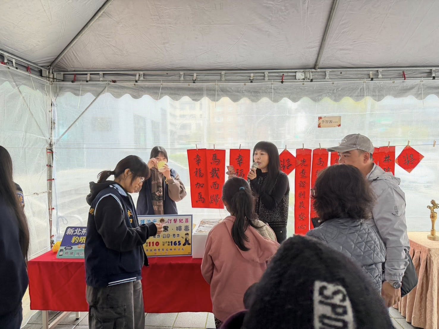 金馬迎春心如意~反詐防詐破騙局。2月1日下午,林口警分局長李智源與淑君阿姨在分局前共同舉辦「和駒納福」春聯揮毫活動,邀請鄉親一同感受傳統書法藝術的魅力,在墨香中迎接嶄新的一年。多位書法名家親臨揮毫,一筆一畫寫下滿滿祝福,吸引大批民眾提前排隊索取春聯,現場掌聲、讚嘆聲不斷。林口警祝福大家迎接好年!馬年行大運。 相關照片 分局長提筆 大合照 筆墨大師揮毫 淑君阿姨致詞